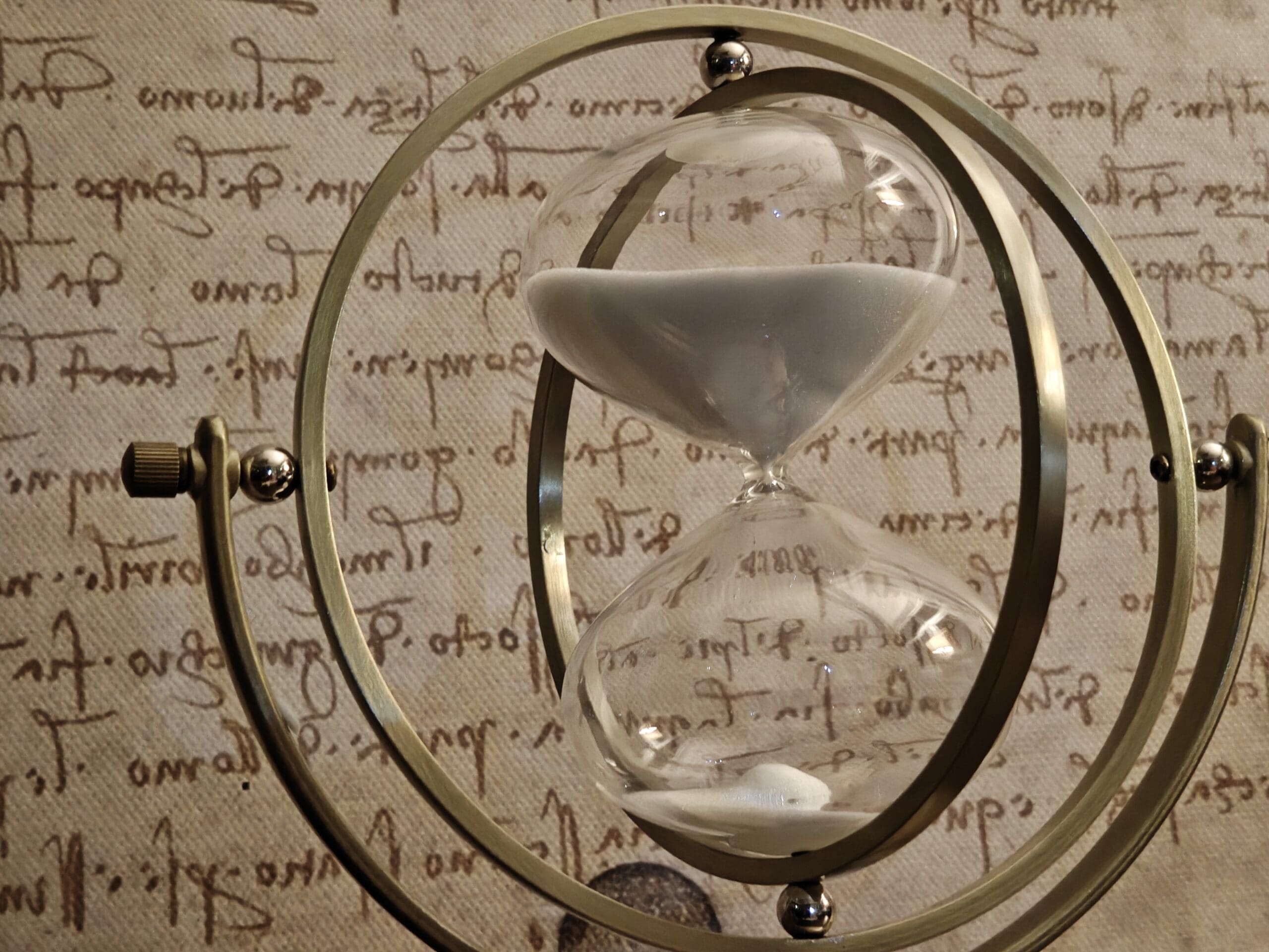 The brass structure is solid and durable, but the hourglass component should be handled with care. Rotate it gently. This is an object to be used thoughtfully, not aggressively.