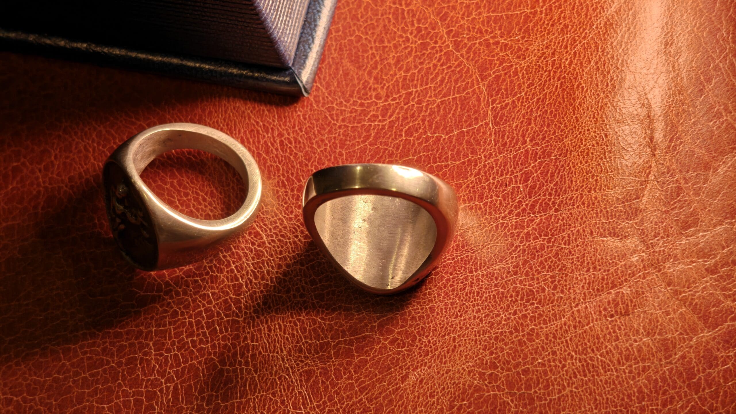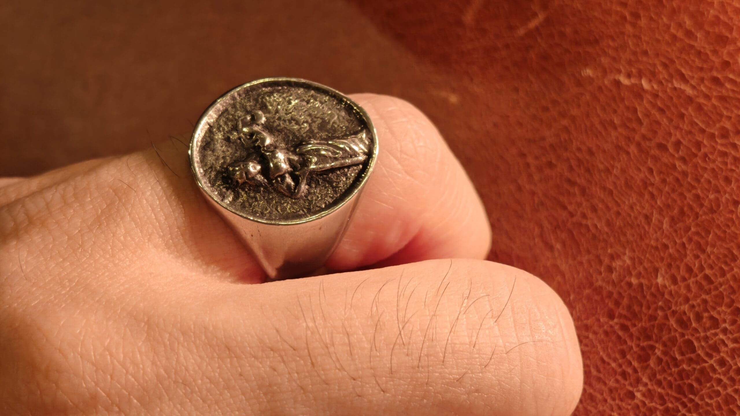 The proportions were refined to give the ring presence without excess: the engraved scales set against a textured face, the band polished smooth to rest naturally against the skin. The weight was selected not for luxury, but for reminder—a steady counterpoint to the impermanence of thought.