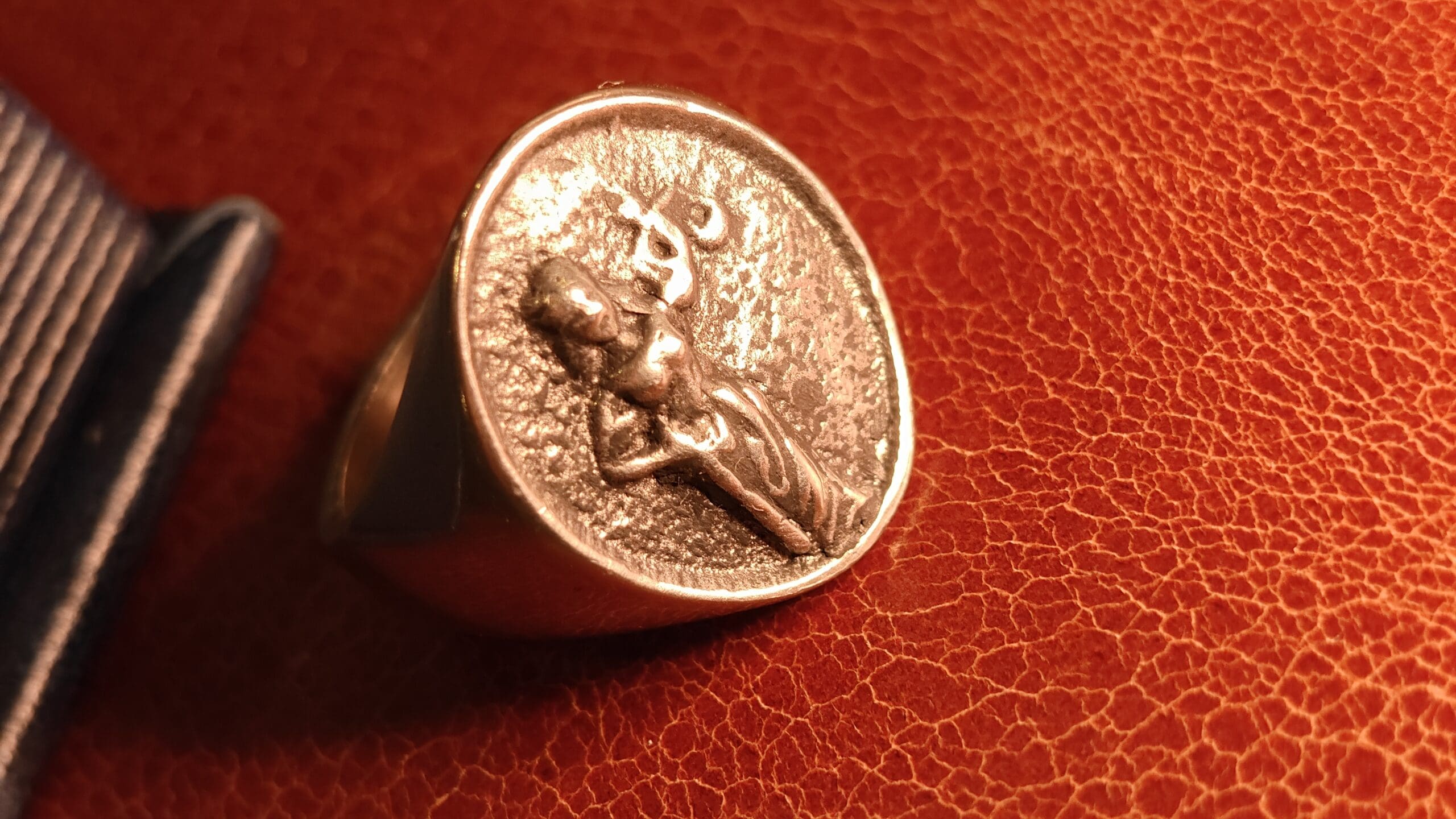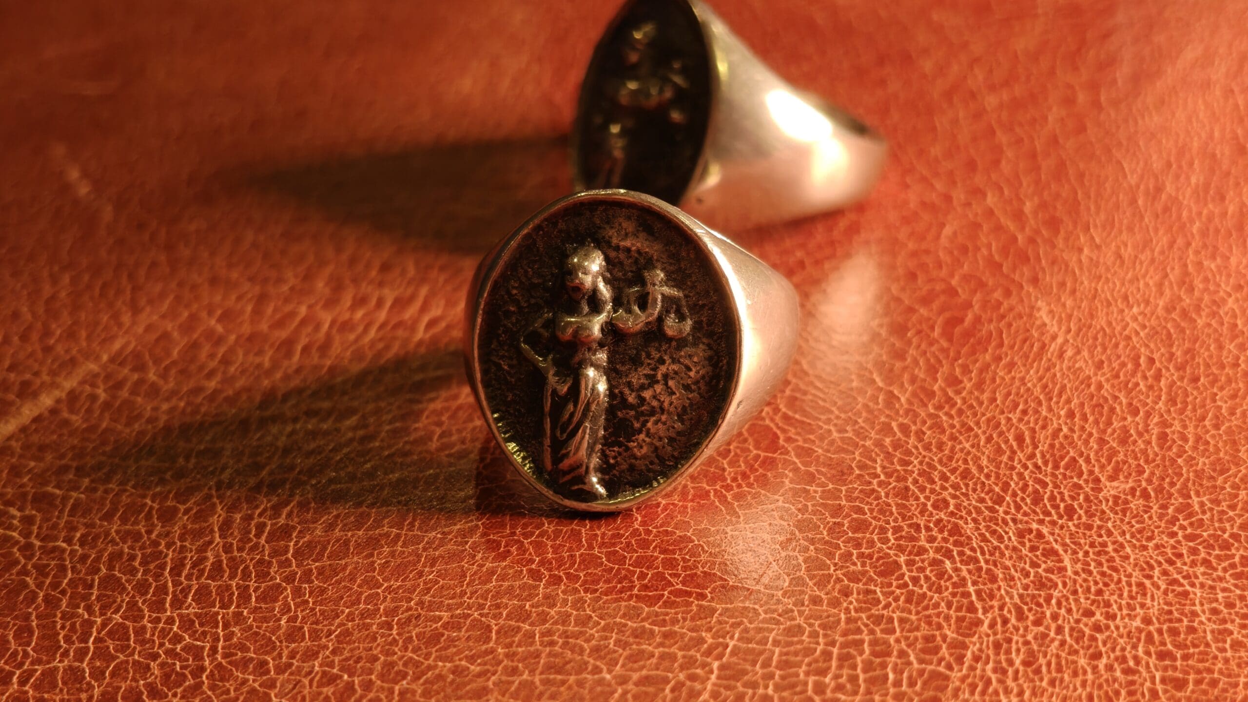 At its face is the engraved figure holding scales, a timeless symbol of equilibrium. It invites you to carry balance with you—whether in thought, in choice, or in daily action. But it is just as much a philosophical object as it is a ring. It rests on your hand not as decoration, but as reminder: that steadiness is not found once, but returned to, again and again.